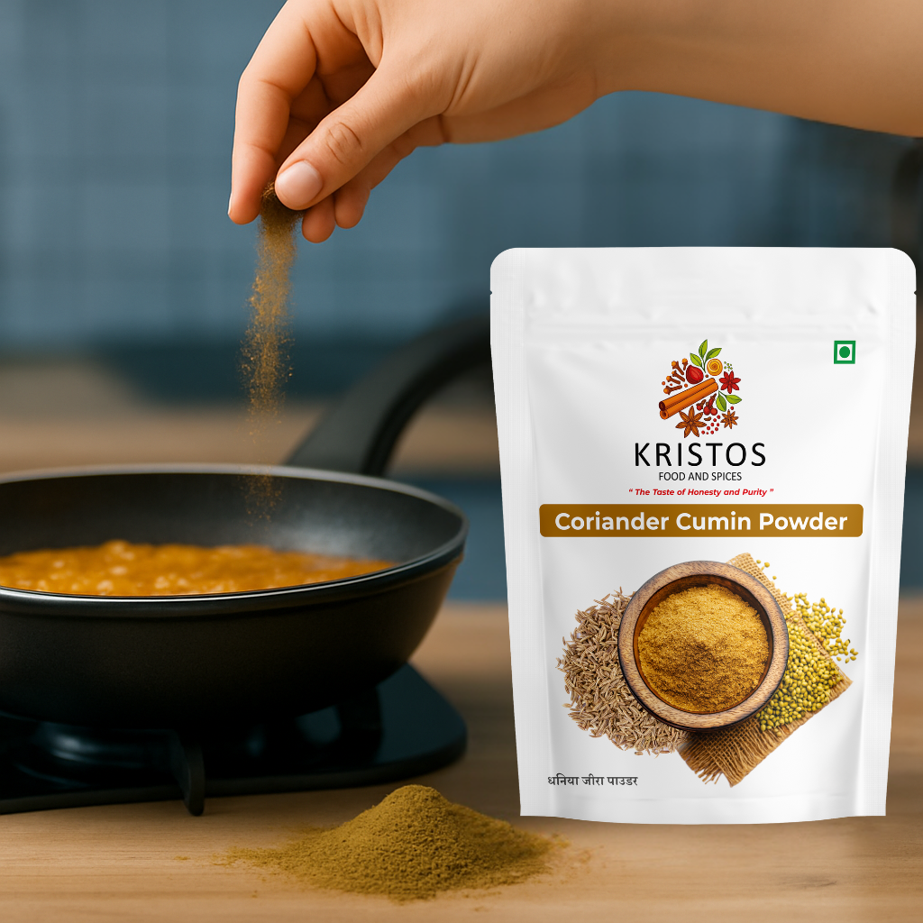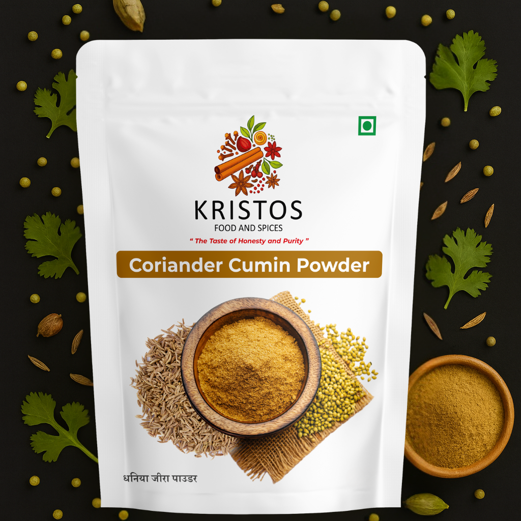 Kristos Coriander Cumin Powder is a classic spice blend that brings together the earthy warmth of cumin and the refreshing aroma of coriander. This golden mix is a staple in Indian kitchens – adding balance, depth, and irresistible flavor to curries, dals, vegetables, and snacks. With its fresh aroma and authentic taste, it turns everyday meals into something truly special.